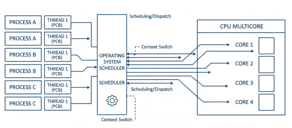 Il sistema operativo divide il tempo in piccole unità di pochi millisecondi, chiamati “quanti” ed assegna a ciascun core un thread in base a regole di priorità. Al termine del quanto sospende quel thread, ed assegna i core ad un altro gruppo di thread, e così indefinitivamente. In altre parole i thread, quindi i processi, fanno a turno per usare la cpu. Siccome la cpu esegue miliardi di operazioni al secondo (e quindi milioni di operazioni di un un quanto) il sistema appare all’utente sempre molto veloce.