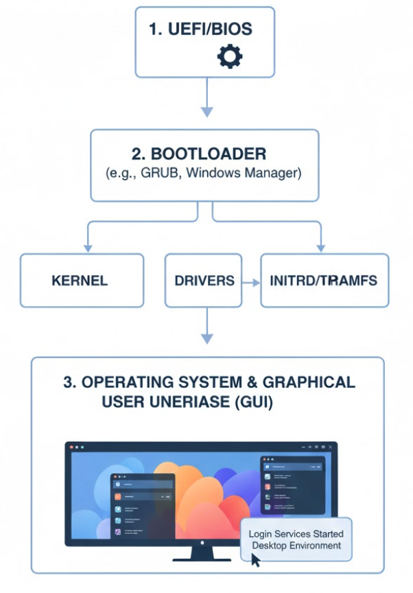 Quindi all’avvio, UEFI avvia il bootloader, che a sua volta carica il sistema operativo. Il sistema operativo all’avvio controlla l’hardware, esegue i driver specifici del computer su cui sta venendo eseguito, carica i programmi di base, le partizioni, la rete, eventuali periferiche ed infine l’interfaccia utente. Al termine di tutto questo presenta una schermata di login dove l’utente inserisce le proprie credenziali di accesso (nome e password oppure impronta oppure riconoscimento facciale). Può essere configurato per un avvio automatico con un determinato utente (Linux e dispositivi mobili).